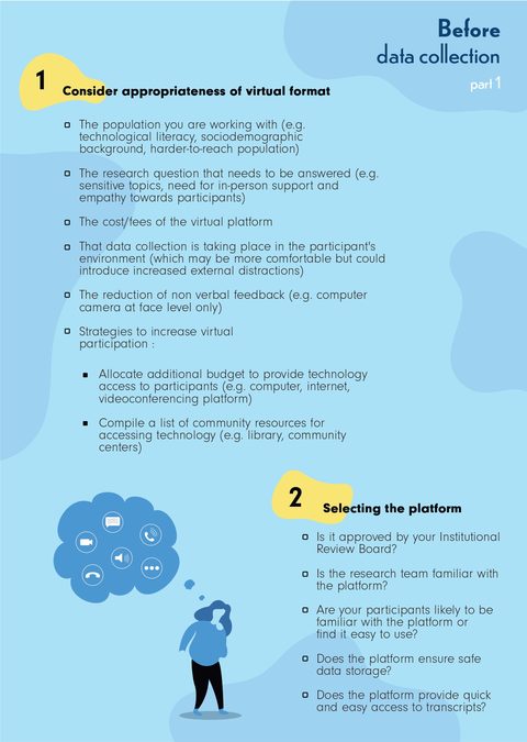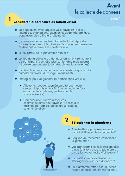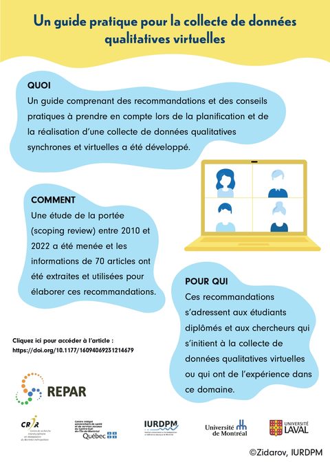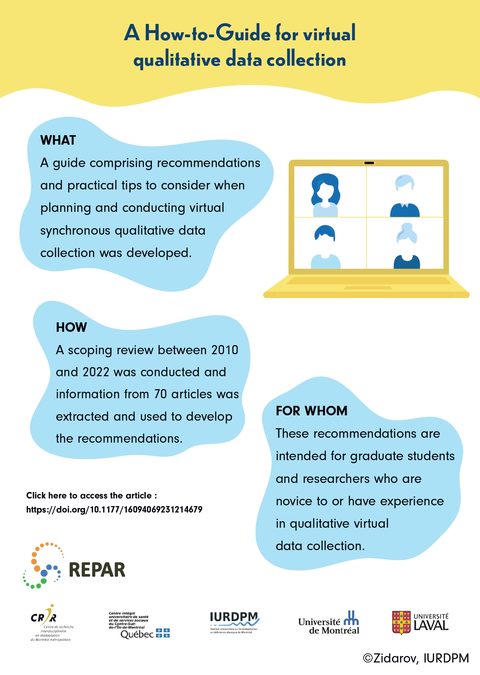 Ce guide sous forme d'infographie (en français et en anglais) réalisée par Diana Zidarov, Ph. D., chercheure d'établissement à l'IURDPM, peut servir d'outil pour informer la communauté étudiante et celle de la recherche, qu’elles soient novices ou non dans ce domaine, sur la meilleure façon de mener une collecte de données qualitatives synchrones virtuelles en se basant sur les expériences antérieures d'autres membres de la recherche et sur les recommandations actuellement disponibles dans la littérature.