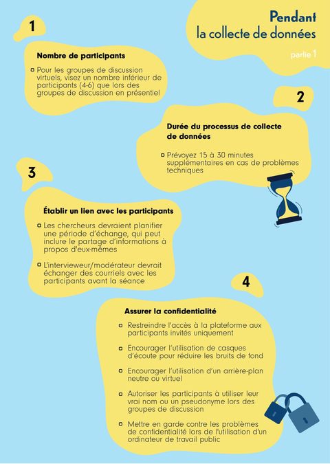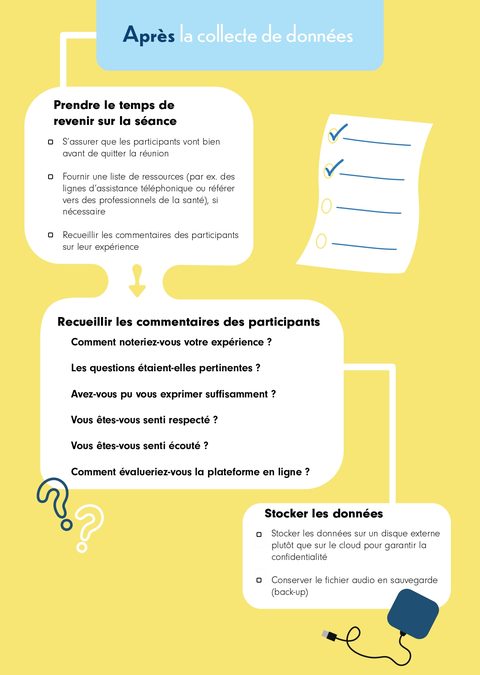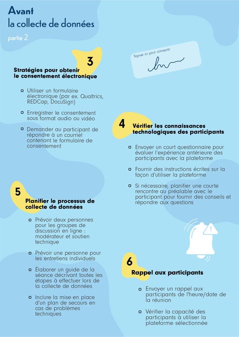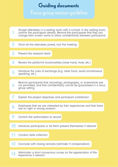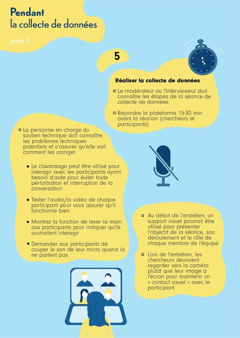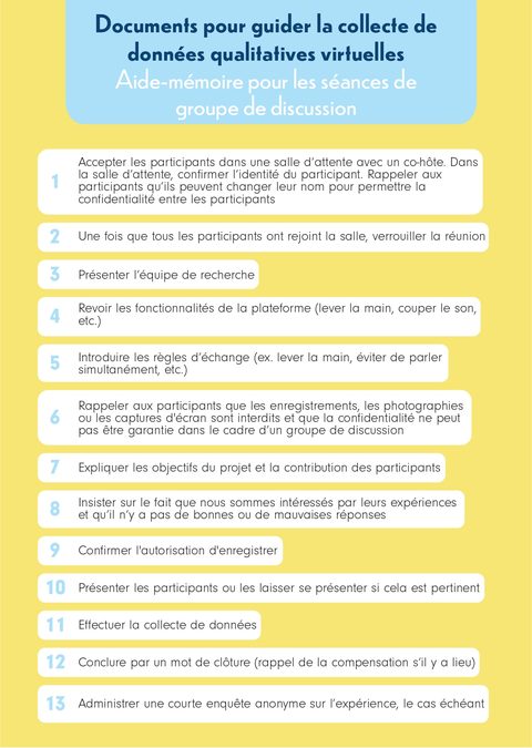 À partir des informations obtenues des 70 articles inclus dans cette revue, ils et elles ont développé un guide pratique comprenant des recommandations à prendre en compte lors de la planification et de la réalisation d’une collecte de données qualitatives.