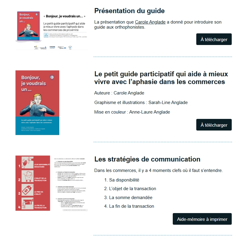- Présenter le guide aux orthophonistes travaillant en réadaptation en aphasie et aux intervenant·e·s du milieu associatif en aphasie,