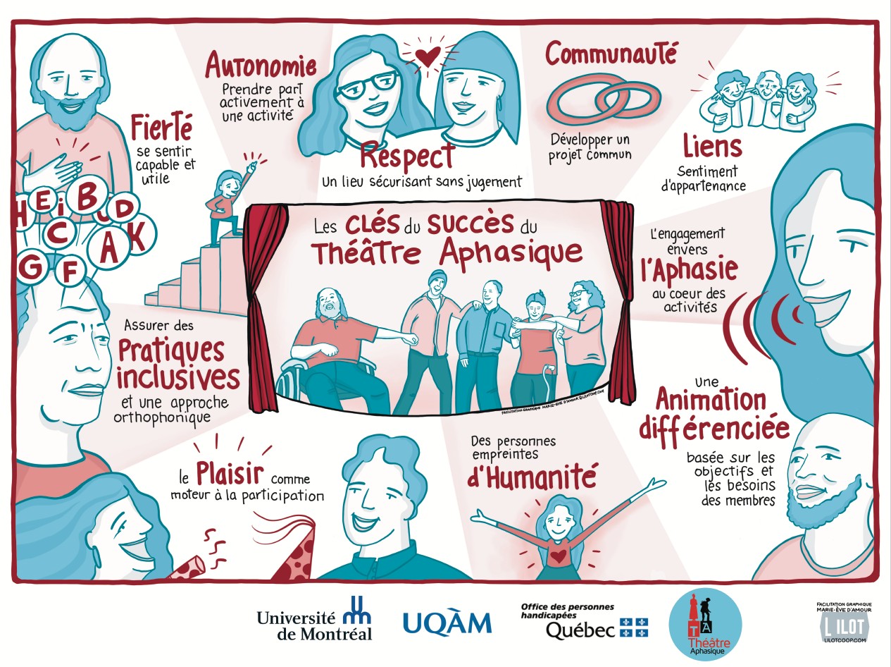 Le Théâtre Aphasique travaille en partenariat avec des équipes de l'IURDPM-CRIR depuis de nombreuses années. Ce partenariat a donné lieu à une démarche de recherche évaluative rigoureuse financé par l'Office des personnes handicapées du Québec (OPHQ). Ces travaux devraient contribuer à l'amélioration continue de ses activités et faciliter leur mise en oeuvre dans d'autres milieux. Plusieurs contenus et communications vulgarisées ont résulté de ces efforts, notamment dans le cadre de travaux étudiants.