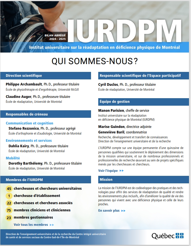 L’IURDPM met les compétences de cette équipe expérimentée au service des personnes vivant avec des problèmes de motricité, de surdité et de communication. Il permet au CCSMTL de jouer son rôle de leader dans le domaine de la réadaptation en déficience physique en offrant les services les plus avancés à sa population.