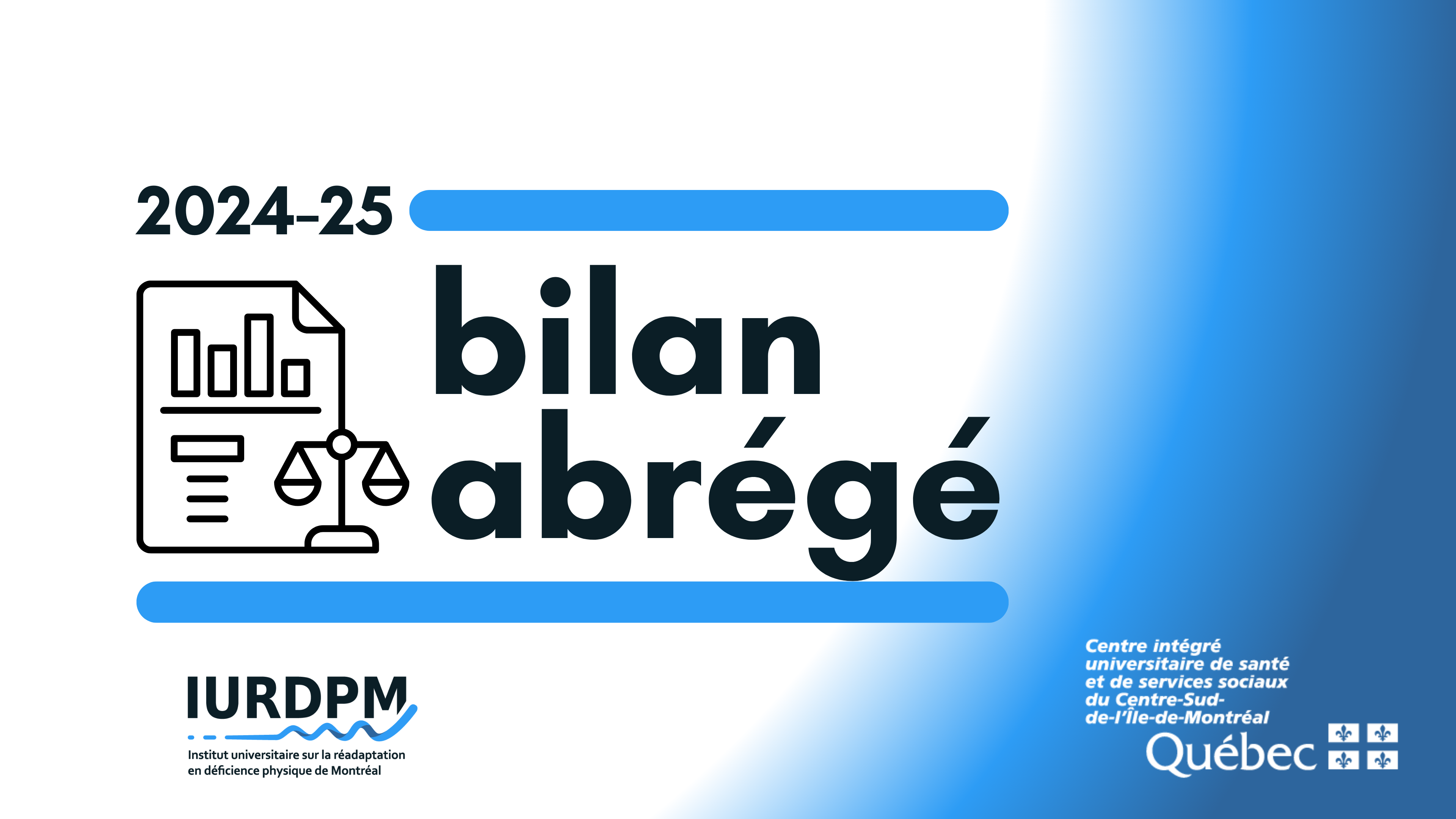 L’année 2024-2025 a été riche en projets, en découvertes et en rencontres pour l’Institut universitaire sur la réadaptation en déficience physique de Montréal (IURDPM). Notre bilan 2024-2025 en témoigne : derrière chaque chiffre se trouvent des histoires de collaboration, de créativité et d’engagement. Les membres chercheurs, gestionnaires, cliniciens, étudiants et patients partenaires ont uni leurs forces pour transformer la réadaptation, faire avancer la recherche et l’innovation en santé, et améliorer la qualité de vie des personnes vivant avec une déficience physique et de leurs proches.