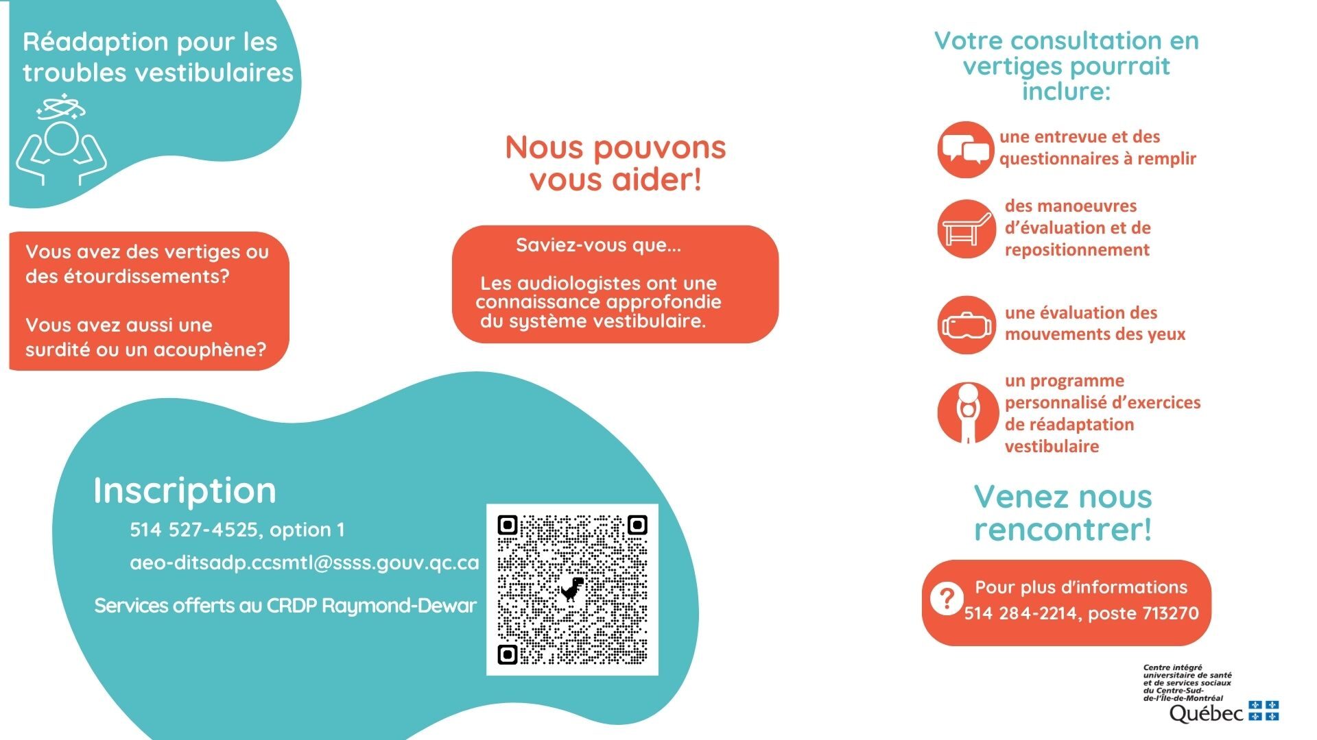 R : Les patients présentant un VPPB sont traités directement par les audiologistes. En cas d’hypofonction bilatérale, ils sont dirigés vers la physiothérapie vestibulaire du programme de l’IRGLM ; si elle est unilatérale, la réadaptation est faite au programme Surdité – Adultes/Aînés.